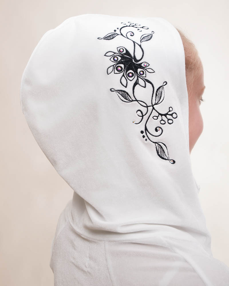 Kaunis ornamentti hupulla molemmassa sivussa. Kirjonnan valikoimassa on 19 eriväristä lankaa. Halutessaan laitamme myös kiiltävät timantit.