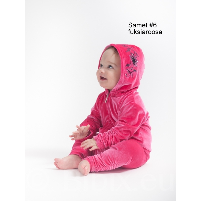 Dressikomplekt beebidele. Komplekti kuuluvad kroogitud säärtega püksid ning kapuutsiga dressipluus. Dressipluusi varrukad on kroogitud. Püksid on kõrge värvliga ning sobivad kenasti veel mähkmetes põnnile. Suurused on pigem pisikese kasvuvaruga!